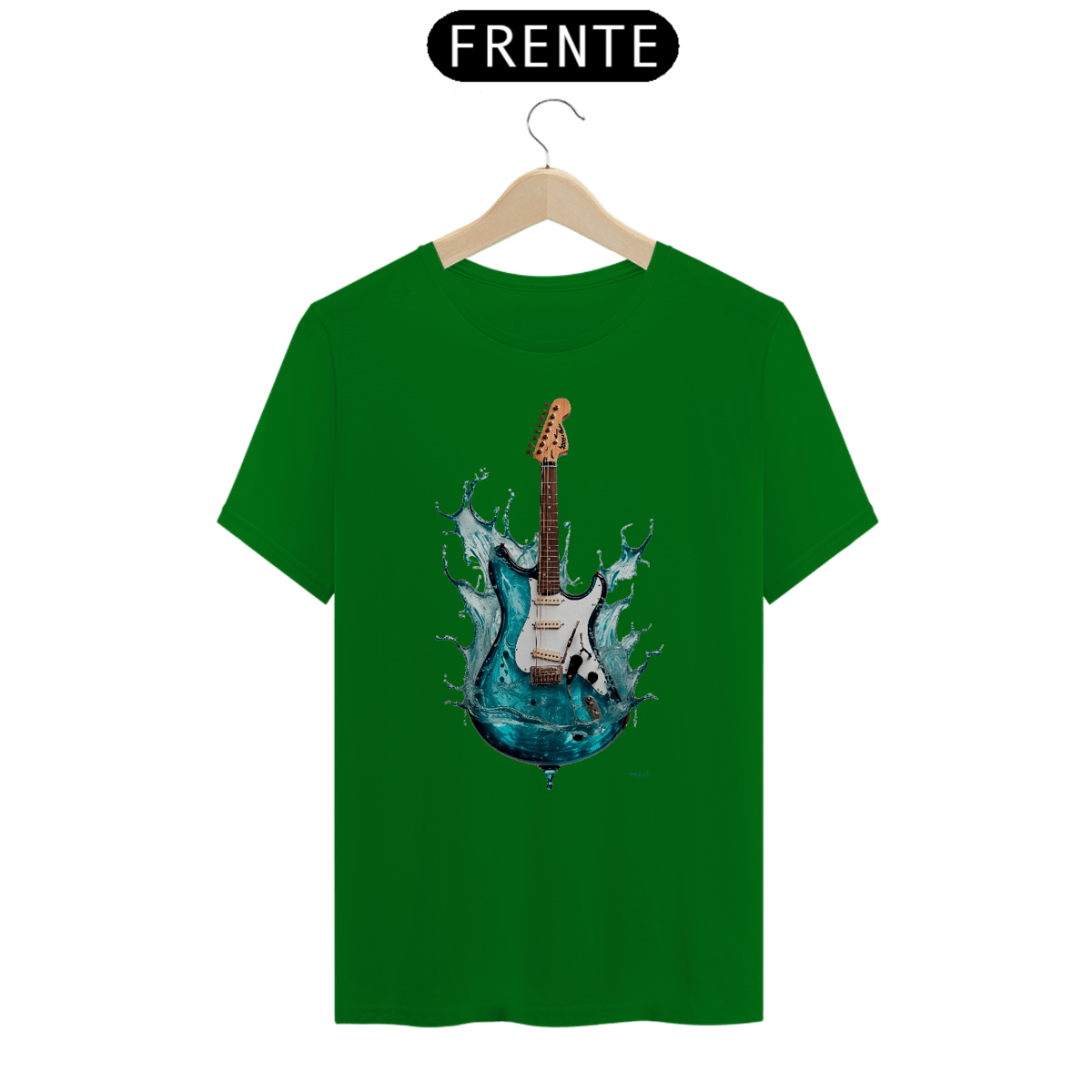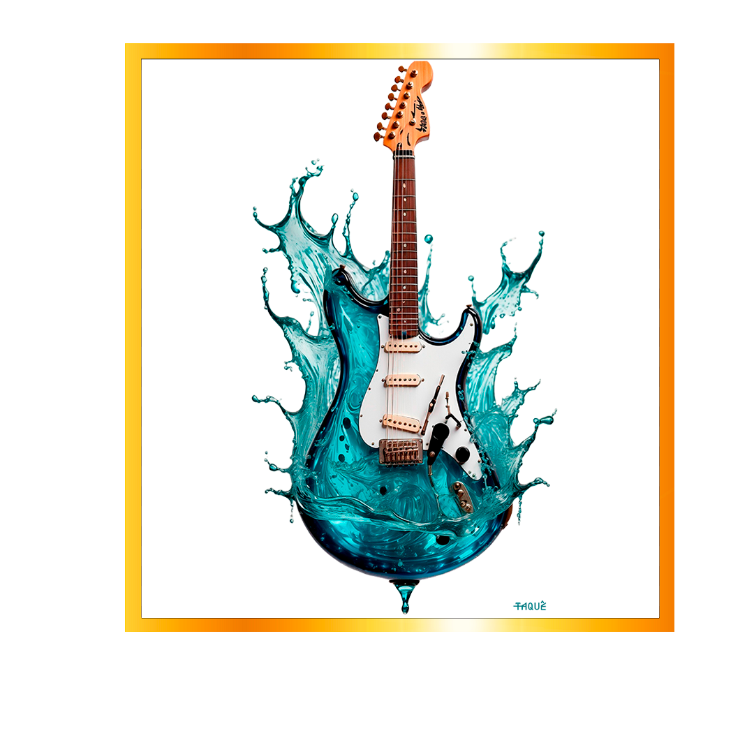 Esta estampa única apresenta uma icônica guitarra elétrica Fender, mas com um toque surpreendente - ela é feita parcialmente de água!